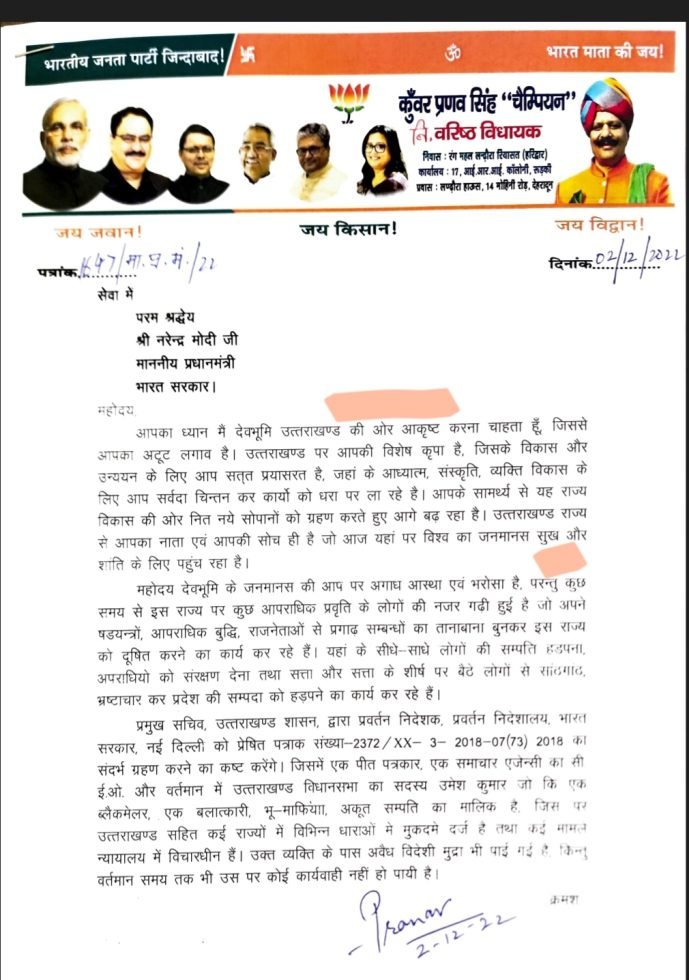 02 दिसंबर 2022 में प्रधानमन्त्री नरेंद्र मोदी को पूर्व भाजपा विधायक कुंवर प्रणव चैंपियन ने निर्दलीय उमेश कुमार से जुड़े विदेशी मुद्रा के मामले में यह पत्र भेजा था।