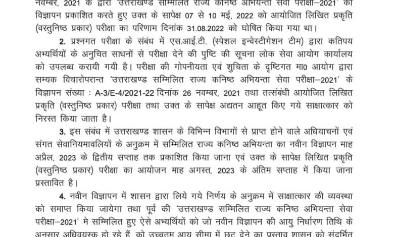 UKPSC नें पेपर लीक के संदेह के चलते सम्मिलित राज्य कनिष्ठ अभियंता सेवा परीक्षा – 2021 रदृ कर दी है । यह परीक्षा फिर से नई सिरे से कराई जाएगी ।आयोग नई भर्ती परीक्षा का कैंलेंडर अप्रैल में फिर से जारी करेगा । इसमें इंटरव्यू नही लिया जाएगा और साथ ही पुराने अभियर्थियों के लिए नई भर्ती में आयोग द्ववारा उम्र तथा शुल्क में छुट दी जाएगी । आयोग के प्रभारी सचिव अधिवेश कुमार सिंह के मुताबिक आयोग सम्मिलित राज्य कनिष्ठ अभियंता सेवा परीक्षा का विज्ञापन अप्रैल के दुसरे हफ्ते में जारी करेगा ।और साथ ही UKPSC नें इस भर्ती परीक्षा को अगस्त माह के अंतिम सप्ताह में करायी जाने की योजना बनाई है।