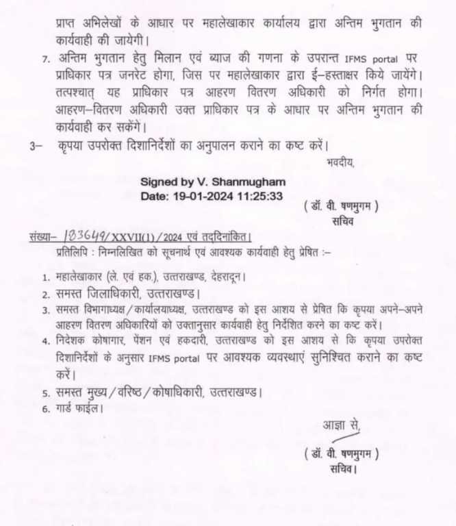 अन्तिम भुगतान की कार्यवाही तत्काल प्रभाव से साईबर ट्रेजरी, देहरादून एवं दिनांक 01.04.