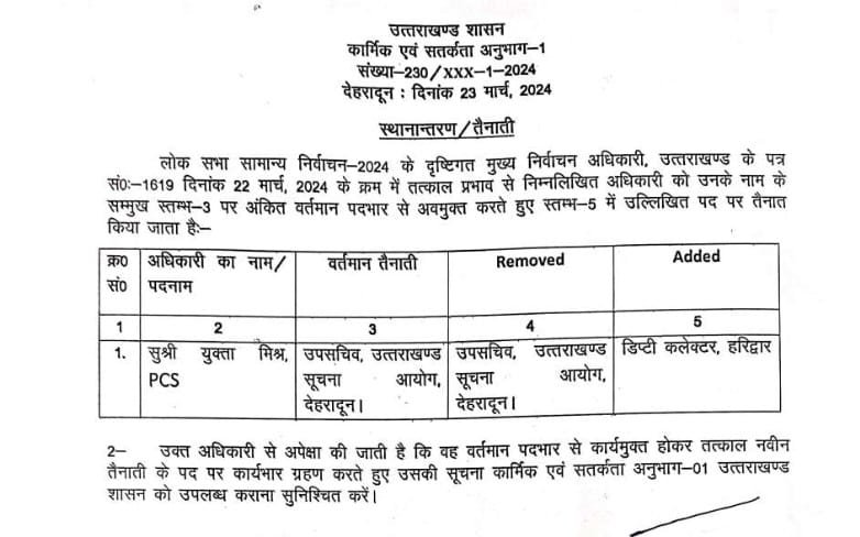 देहरादून : उत्तराखंड शासन द्वारा लोकसभा निर्वाचन को स्वतंत्र, निष्पक्ष, पारदर्शिता से सफलतापूर्वक संपन्न कराने हेतु मुख्य निर्वाचन अधिकारी, उत्तराखण्ड के पत्र सं० 1619 दिनांक 22 मार्च, 2024 के क्रम में तत्काल प्रभाव से युक्ता मिश्र पीसीएस को उपसचिव, उत्तराखण्ड सूचना देहरादून से डिप्टी कलेक्टर, हरिद्वार के पदभार पर नियुक्त किया गया है।