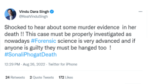 अभिनेता और बिग बॉस फेम विंदू दारा सिंह ने भी ट्वीट कर सोनाली के लिए इंसाफ की मांग की