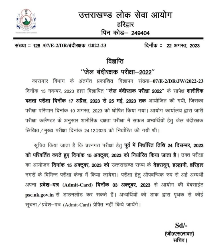 उक्त परीक्षा का आयोजन दिनांक 15 अक्टूबर, 2023 को उत्तराखण्ड राज्य के देहरादून, हल्द्वानी, हरिद्वार नगरों के विभिन्न परीक्षा केन्द्र में किया जायेगा। परीक्षा हेतु औपबन्धिक रुप से अर्ह अभ्यर्थी अपना प्रवेश-पत्र (Admit Card) दिनाँक 03 अक्टूबर, 2023 से आयोग की वेबसाईट psc.uk.gov.in से डाउनलोड कर सकते हैं। अभ्यर्थियों को डाक द्वारा पृथक से कोई सूचना / प्रवेश-पत्र ( Admit Card) प्रेषित नहीं किये जायेंगे