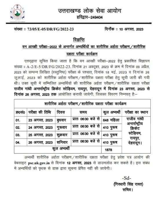UKPSC ने वन आरक्षी परीक्षा – 2022 के अन्तर्गत अभ्यर्थियों का शारीरिक अर्हता परीक्षण / शारीरिक दक्षता परीक्षा कार्यक्रम विज्ञप्ति के माध्यम से जारी किया है। एतद्द्वारा सूचित किया जाता है कि, वन आरक्षी परीक्षा 2022 हेतु प्रकाशित विज्ञापन संख्या : A-2/E-5/DR/FG/2022-23. दिनांक 21 अक्टूबर, 2023 के क्रम में दिनांक 09 अप्रैल, 2023 को सम्पन्न लिखित (वस्तुनिष्ठ) परीक्षा के पश्चात, दिनांक 18 मई, 2023 व दिनांक 26 जुलाई, 2023 को शारीरिक अर्हता परीक्षण / शारीरिक दक्षता परीक्षा हेतु सूची जारी की गयी थी। उक्त सूची में सम्मिलित अभ्यर्थियों की शारीरिक अर्हता परीक्षण / शारीरिक दक्षता परीक्षा राजीव गांधी अन्तर्राष्ट्रीय क्रिकेट स्टेडियम, रायपुर, देहरादून में दिनांक 23 अगस्त, 2023 से दिनांक 26 अगस्त, 2023 तक आयोजित करायी जायेगी, जिसका विवरण निम्नवत् है:- शारीरिक अर्हता परीक्षण / शारीरिक दक्षता परीक्षा कार्यक्रम अभ्यर्थी शारीरिक अर्हता परीक्षण / शारीरिक दक्षता परीक्षा हेतु प्रवेश पत्र आयोग की वेबसाइट psc.uk.gov.in से दिनांक 12 अगस्त, 2023 से डाउनलोड कर सकते है। इस संबंध में अभ्यर्थियों को पृथक से डाक द्वारा सूचना प्रेषित नहीं की जायेगी।