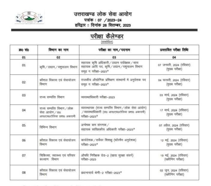 जारी कैलेंडर में लिखा है कि वर्तमान परीक्षा कैलेन्डर में 03 नवीन परीक्षायें (क्रम संख्या 08 07 एवं 08) जोड़ते हुये उनकी प्रस्तावित परीक्षा तिथि उपरोक्तानुसार प्रकाशित की जा रही है। कैलेंडर के अनुसार पहली परीक्षा सात जनवरी 2024 को होगी। इसके अलावा विभाग ने जून 2024 तक की परीक्षा का पूरा ब्यौरा दिया है।