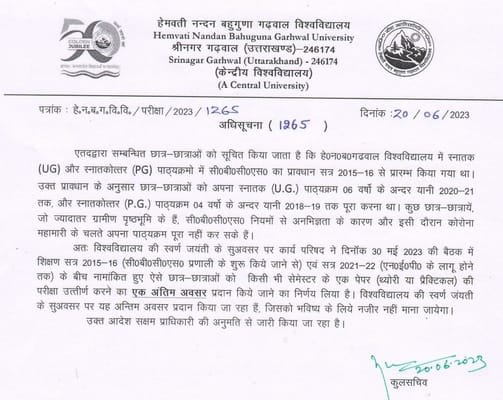 कुलसचिव ने बताया कि विश्वविद्यालय की कार्य परिषद ने 30 मई 2023 की बैठक में शिक्षण सत्र 2015-16 (सी0बी0सी0एस0 प्रणाली के शुरू किये जाने से) एवं सत्र 2021-22 (एन०ई०पी० के हो लागू तक) के बीच नामांकित हुए ऐसे छात्र – छात्राओं को किसी भी सेमेस्टर के एक पेपर ( थ्योरी या प्रैक्टिकल) की परीक्षा उत्तीर्ण करने का एक अंतिम अवसर प्रदान किये जाने का निर्णय लिया है। विश्वविद्यालय की स्वर्ण जंयती के सुअवसर पर यह अन्तिम अवसर प्रदान किया जा रहा हैं, जिसको भविष्य के लिये नजीर नहीं माना जायेगा ।