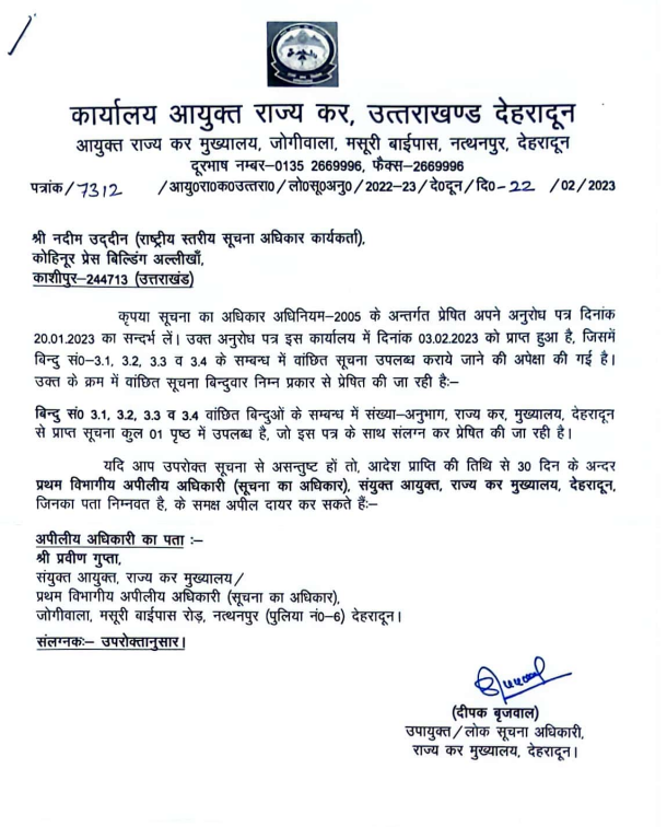 काशीपुर निवासी सूचना अधिकार कार्यकर्ता नदीम उद्ीन एडवोकेट नेेे आयुक्त कर कार्यालय से प्रदेश भर में शराब पर वसूले गये टैक्स राजस्व की धनराशियों की सूचना मांगी थी। इसके उत्तर में राज्य कर मुख्यालय देहरादून के लोक सूचना अधिकारी/उपायुक्त दीपक बृजवाल ने अपने पत्रांक 7312 से 2020-21 से 20022-23 (जनवरी 2023 तक) के शराब से प्राप्त कर राजस्व की धनराशियों की सूचना उपलब्ध करायी है। इससे पूर्व 2001-02 से 2020-21 तक की धनराशियों की सूचनां उपलब्ध करायी जा चुकी है।