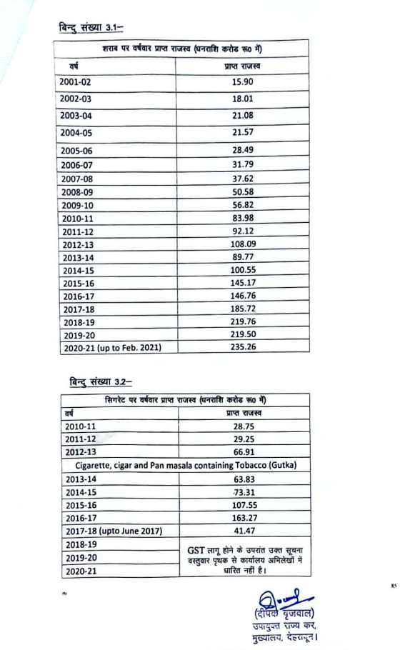 उत्तराखंड के राज्य कर विभाग सैल्सटैक्स/वैट से वित्तीय वर्ष 2001-02 से 2022-23 (जनवरी 23 तक) 2648.1 करोड़ रू. का टैक्स राजस्व शराब की बिक्री पर वसूला है। वर्ष 2022-23 का कुल टैक्स राजस्व रू. 361.05 करोड़ वर्ष 2001-02 के रू. 15.90 करोड़ की तुलना में 22 गुणा से अधिक है। यह खुलासा राज्य कर मुख्यालय द्वारा सूचना अधिकार कार्यकर्ता नदीम उद्दीन को उपलब्ध करायी गयी सूचना से हुआ।