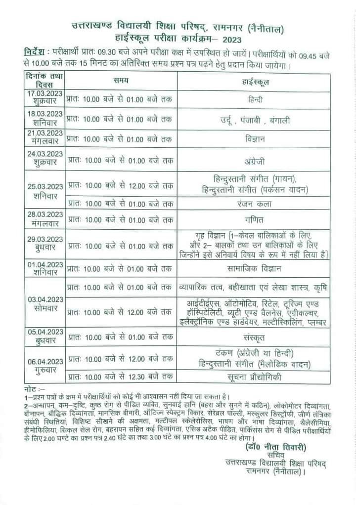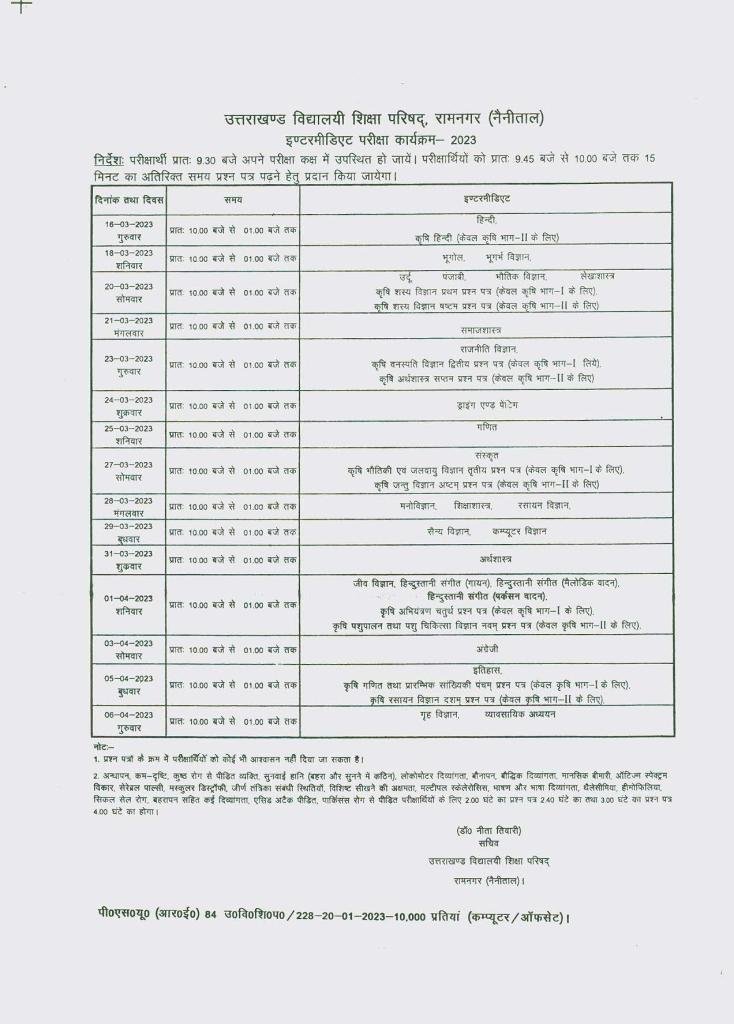 Uttarakhand: High School-Intermediate candidates take a look at the time table हल्द्वानी: उत्तराखंड बोर्ड (Uttarakhand Board) की परीक्षाएं 17 मार्च 2023 से शुरू हो रही है जो कि 6 अप्रैल 2023 को समाप्त होंगी। यह परीक्षाएं सुबह 10 बजे से दोपहर 1 बजे तक होंगी। अगर आप भी इस साल हाईस्कूल और इंटरमीडिएट बोर्ड की परीक्षा देने जा रहे हैं तो एक बार फिर परीक्षा कार्यक्रम यानि टाइम टेबल पर नजर डाल लें।   परीक्षाएं उत्तराखंड के 1253 केंद्रों पर संपन्न होंगी। इनमें 198 केंद्र संवेदनशील और 15 अति संवेदनशील बनाए गए हैं। इस वर्ष हाईस्कूल परीक्षा में 1 लाख 32 हजार 115 और इंटरमीडिएट में 1 लाख 27 हजार 324 परीक्षार्थी शामिल होंगे। परीक्षा केंद्रों पर मोबाइल फोन ले जाना पूरी तरह प्रतिबंधित रहेगा। 15 अप्रैल से 29 अप्रैल 2023 तक उत्तर पुस्तिकाओं का मूल्यांकन किया जाएगा और परीक्षाफल की घोषणा मई माह के अंतिम सप्ताह में किया जाएगा।