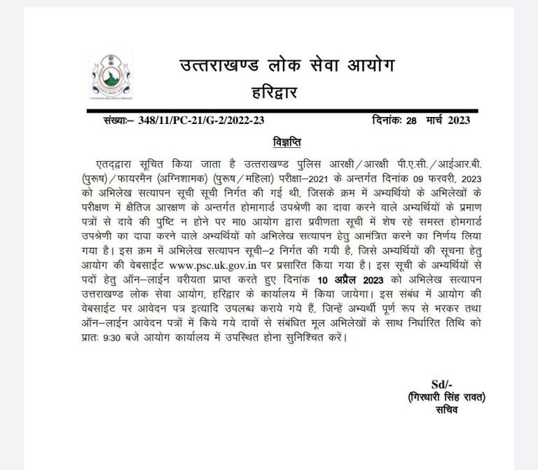 इस क्रम में अभिलेख सत्यापन सूची -2 निर्गत की गयी है, जिसे अभ्यर्थियों की सूचना हेतु आयोग की वेबसाईट www.psc.uk.gov.in पर प्रसारित किया गया है। इस सूची के अभ्यर्थियों से पदों हेतु ऑन-लाईन वरीयता प्राप्त करते हुए दिनांक 10 अप्रैल 2023 को अभिलेख सत्यापन उत्तराखण्ड लोक सेवा आयोग, हरिद्वार के कार्यालय में किया जायेगा।
