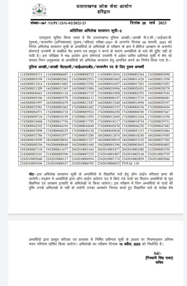 आयोग के सचिव गिरधारी सिंह रावत द्वारा जारी आदेश के अनुसारउत्तराखण्ड पुलिस आरक्षी/आरक्षी पी.ए.सी./आईआर.बी.(पुरूष)/ फायरमैन (अग्निशामक) (पुरुष/महिला) परीक्षा- 2021 के अन्तर्गत दिनांक 09 फरवरी, 2023 को अभिलेख सत्यापन सूची निर्गत की गई थी, जिसके क्रम में अभ्यर्थियो के अभिलेखों के परीक्षण में क्षैतिज आरक्षण के अन्तर्गत होमागार्ड उपश्रेणी का दावा करने वाले अभ्यर्थियों के प्रमाण पत्रों से दावे की पुष्टि न होने पर आयोग द्वारा प्रवीणता सूची में शेष रहे समस्त होमगार्ड उपश्रेणी का दावा करने वाले अभ्यर्थियों को अभिलेख सत्यापन हेतु आमंत्रित करने का निर्णय लिया गया है।