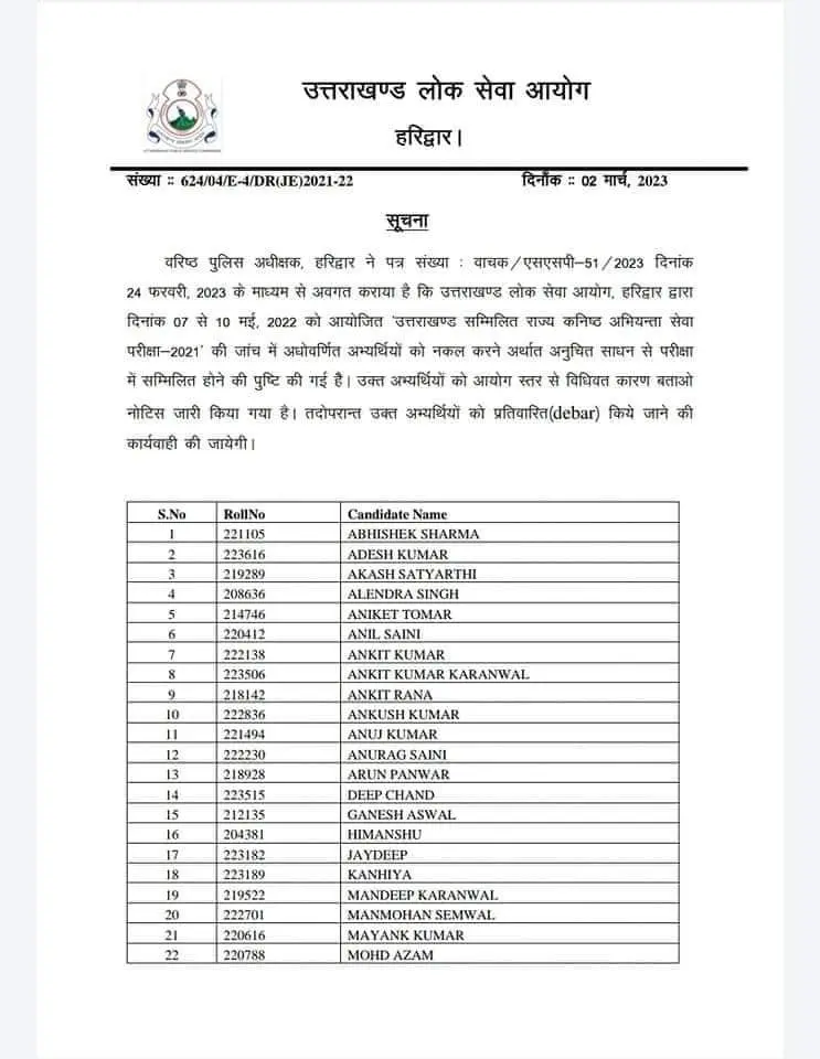 देहरादून : उत्तराखंड में सम्मिलित राज्य कनिष्ठ अभियंता सेवा परीक्षा-2021 के पेपर लीक में शामिल पाए गए 49 और अभ्यर्थियों को राज्य लोक सेवा आयोग ने नोटिस जारी करते हुए उनकी सूची वेबसाइट पर जारी कर दी है। इन अभ्यर्थियों का जवाब आने के बाद आयोग इन्हें परीक्षाओं से प्रतिवारित(डिबार) करेगा।