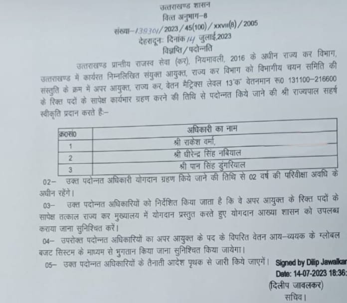 देहरादून : उत्तराखंड से बड़ी खबर सामने आ रही है जहां राज्य करण विभाग में प्रमोशन किए गए हैं। उत्तराखंड प्रांतीय राजस्व सेवा कर नियमावली 2016 ‘क’ अधीन राज्य कर विभाग उत्तराखंड में कार्यरत निम्नलिखित संयुक्त आयुक्त राज्य कर विभाग को विभागीय चयन समिति की संस्कृति के क्रम में अवर आयुक्त राज्य का वेतन मैट्रिक्स लेवल 13 के वेतनमान रुपए 131100-216600 ‘क’ रिक्त पदों के सापेक्ष कार्यभार ग्रहण करने की तिथि से पदोन्नति किए जाने की राज्यपाल सहर्ष स्वीकृति प्रदान करते हैं।