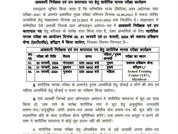 देहरादून : लोक सेवा आयोग सम्मिलित राज्य सिविल अवर अधीनस्थ सेवा परीक्षा के तहत आबकारी निरीक्षक और उप कारापाल के लिए शारीरिक मानक परीक्षा 30 जनवरी से होगी। आयोग ने इसके लिए प्रवेशपत्र जारी कर दिए हैं।