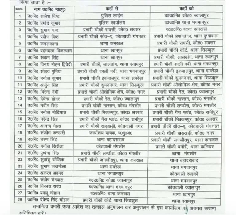 तबादला सूची के अनुसार राजेश बिष्ट को पुलिस लाइन से एसएसआई ज्वालापुर बनाया गया है, तो प्रमोद कुमार को पुलिस कार्यालय से एसएसआई भगवानपुर बनाया गया है,