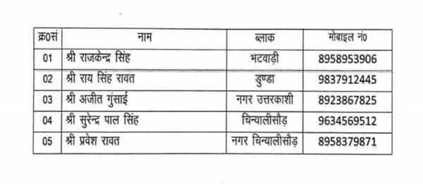 जिसमे जनपद उत्तरकाशी मे भी प्रदेश कांग्रेस के अनुमोदन पर उत्तरकाशी नगर अध्यक्ष पद पर पालिका सभाषद अजीत गुसाईं, भटवाड़ी ब्लॉक अध्यक्ष पद पर राजकेंद्र थनवान,डुंडा ब्लॉक राय सिंह रावत,चिन्यालीसौड़ सुरेंद्र पाल सिंह व चिन्यालीसौड़ नगर अध्यक्ष प्रवेश रावत को पदभार दिया गया है।
