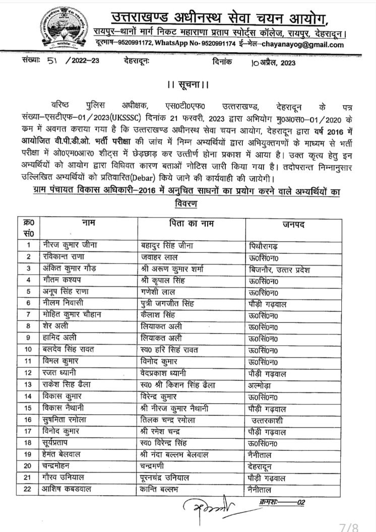 वीपीडीओ भर्ती का पेपर लीक होने के सात साल बाद उसके आरोपी अभ्यर्थियों पर शिकंजा कसा जा रहा है। आयोग ने 35 अभ्यर्थियों की सूची जारी करते हुए उन्हें कारण बताओ नोटिस भेजा है। जवाब आने के बाद आयोग इन सभी पर पांच साल का प्रतिबंध लगाएगा। अधीनस्थ सेवा चयन आयोग ने छह मार्च 2016 को ग्राम पंचायत विकास अधिकारी (वीपीडीओ) के 196 पदों पर भर्ती के लिए परीक्षा कराई थी। भर्ती में ओएमआर शीट को दो सप्ताह तक गुप्त स्थान पर रखकर उसमें छेड़छाड़ करने के आरोप लगे थे। इसका परिणाम उसी साल 26 मार्च को जारी किया था। दो सगे भाई टॉपर बन गए थे तो ऊधमसिंह नगर जिले के एक ही गांव के 20 से ज्यादा युवाओं का चयन हो गया था। इस मामले की जांच हुई थी लेकिन कार्रवाई नहीं हुई थी। परीक्षा एक दिसंबर 2017 को रद्द हो गई थी आयोग के तत्कालीन अध्यक्ष आरबीएस रावत ने इस्तीफा दे दिया था। बाद में परीक्षा एक दिसंबर 2017 को रद्द हो गई थी। आयोग ने 25 फरवरी 2018 को दोबारा परीक्षा कराई थी। 2016 की परीक्षा में हुई गड़बड़ी का पर्दाफाश पिछले साल हुई स्नातक स्तरीय परीक्षा पेपर लीक के बाद हुआ। एक बार फिर जांच हुई और आयोग के तत्कालीन अध्यक्ष आरबीएस रावत, सचिव व परीक्षा नियंत्रक को जेल जाना पड़ा। अब गड़बड़ी करने वाले 35 अभ्यर्थियों पर आयोग ने शिकंजा कसा है। आयोग की वेबसाइट पर उनके नाम सार्वजनिक कर नोटिस जारी किया गया है। जवाब मिलने के बाद आगे की कार्रवाई की जाएगी।