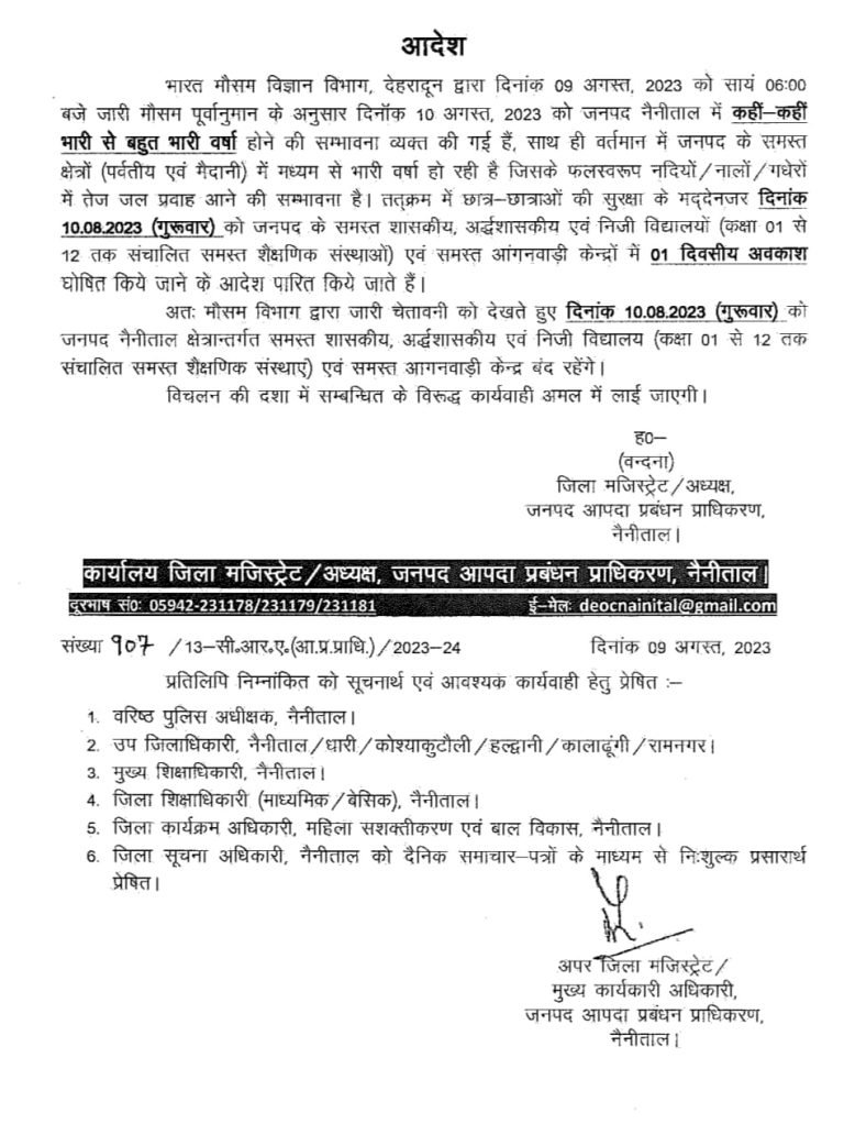 नैनीताल : मौसम विभाग देहरादून के द्वारा जारी पूर्वानुमान के अनुसार 10 अगस्त के मध्य जनपद नैनीताल में कहीं-कहीं भारी से बहुत भारी वर्षा होने की सम्भावना व्यक्त की गई है, साथ ही वर्तमान में जनपद के समस्त पर्वतीय एवं मैदानी क्षेत्रों में मध्यम से भारी वर्षा होने व नदियों,नालों, गधेरों मेें तेज जलप्रवाह की सम्भावना को देखते हुये आपदा प्रबंधन एवं पुर्नवास उत्तराखण्ड शासन के आदेशों के क्रम में जिला मजिस्ट्रेट/अध्यक्ष आपदा प्रबंधन प्राधिकरण वंदना ने सम्भावित आपदाओं के प्रबंधन एवं न्यूनीकरण के दृष्टिगत 10 अगस्त को जनपद के समस्त विद्यालयों, निजी एवं सरकारी विद्यालयों में कक्षा 1 से 12 तक के छात्र-छात्राओं एवं आंगनबाडी केेन्द्रों के लिए अवकाश घोषित किया है।